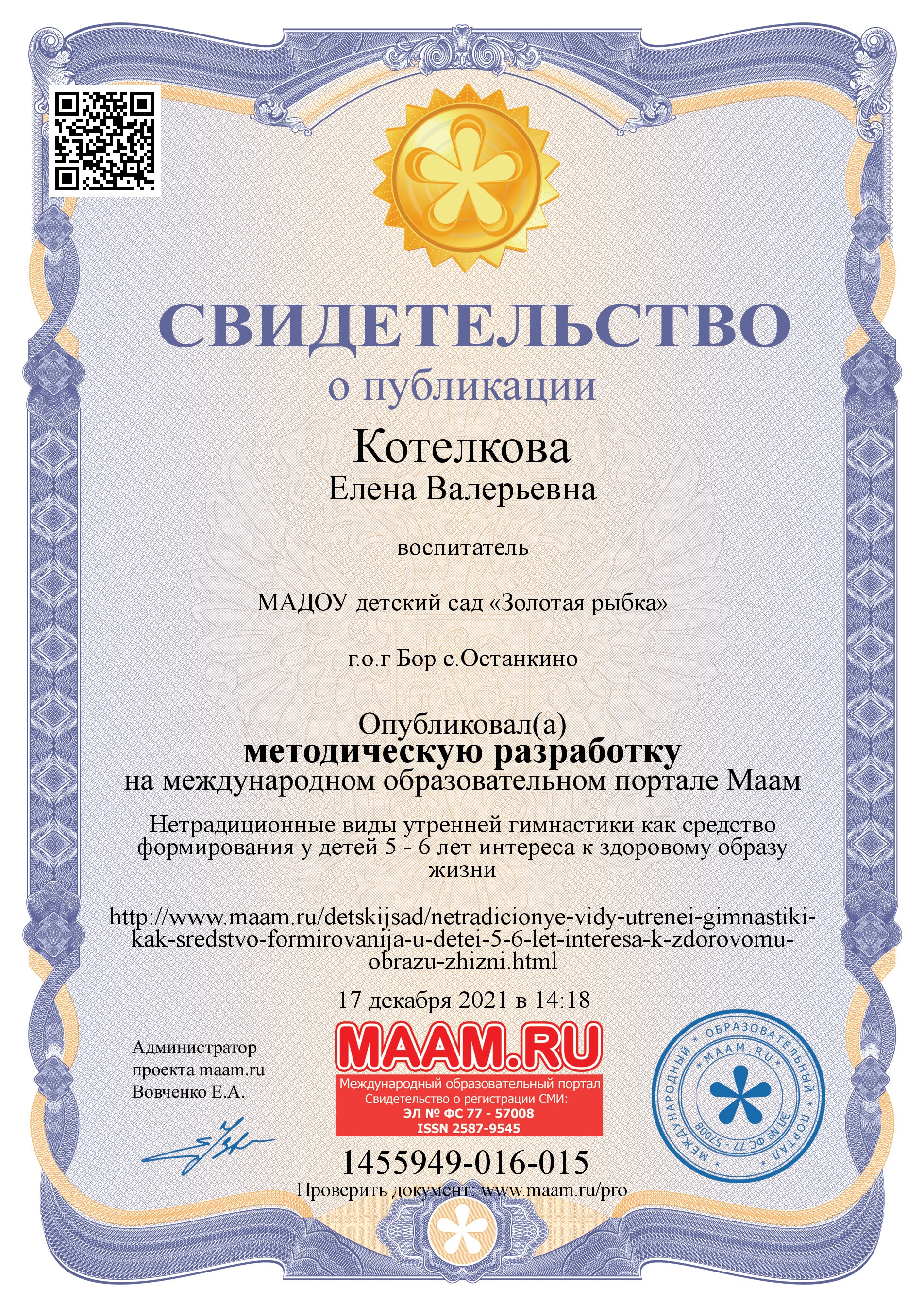 Сертификат о публикации в СМИ